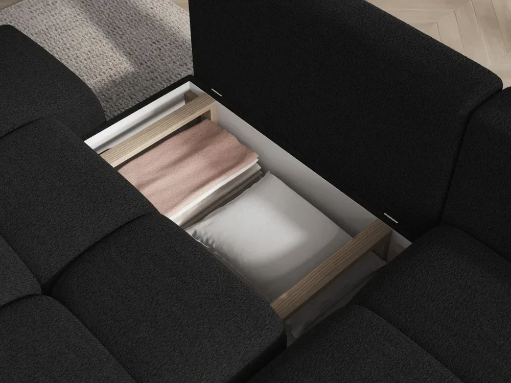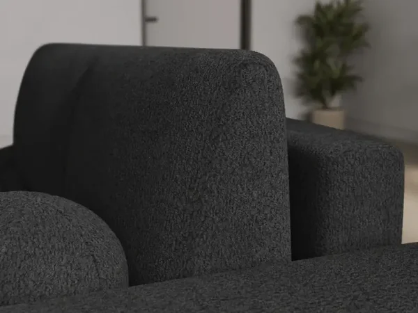 Le canapé d’angle Kléber mesure 227 × 170 × 95 cm et offre une assise spacieuse de 205 cm, avec une profondeur de 75 cm et une hauteur d’assise de 50 cm. Il intègre un véritable couchage de 95 × 205 cm grâce à un mécanisme DL assisté par ressort pour une ouverture facile. La structure est réalisée en bois de pin, l’assise est composée de ressorts ondulés Type B, mousse HR3030 et mousse T2315, tandis que les dossiers sont garnis de granulés de mousse pour un confort enveloppant. Le canapé dispose d’un coffre de rangement de 85 × 60 × 23 cm, d’accoudoirs arrondis, de pieds noirs de 3,5 cm et d’une capacité de charge de 270 kg. Revêtu d’un tissu 100% polyester , il est livré en 2 colis (175 × 95 × 80 cm – 69 kg et 140 × 70 × 80 cm – 51 kg), nécessite un assemblage partiel, et bénéficie d’une garantie de 2 ans.