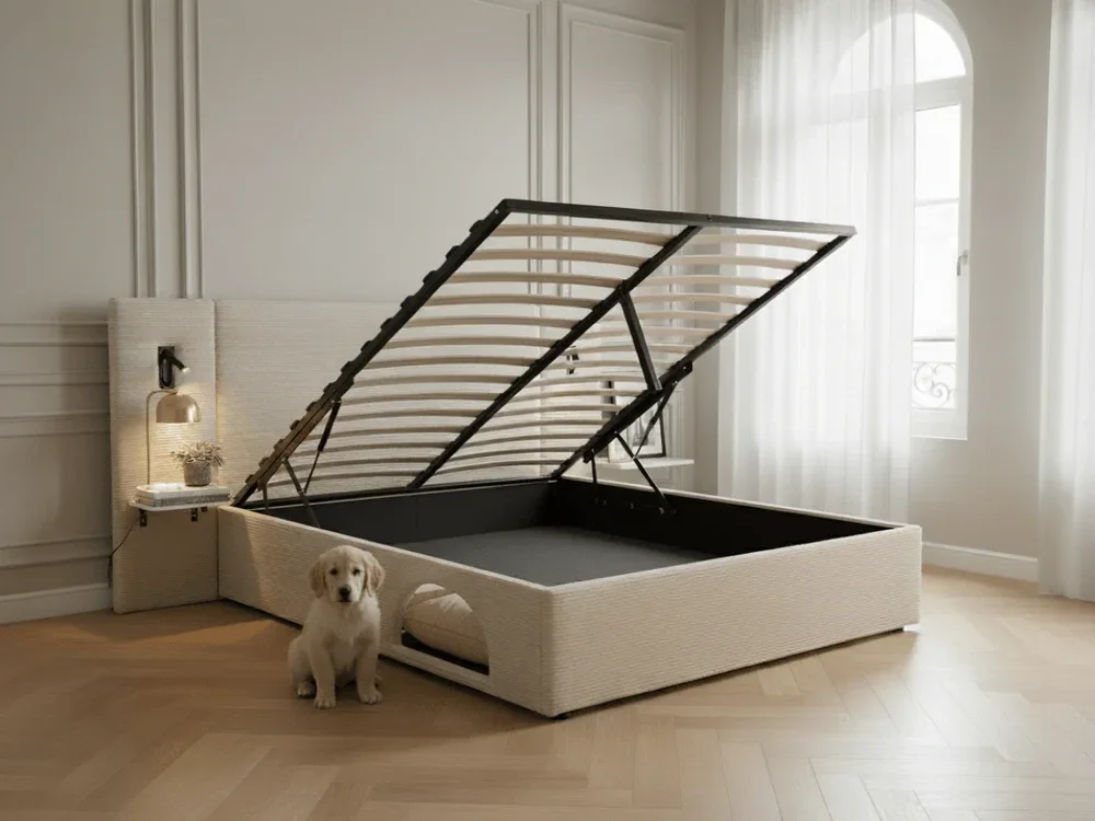Le lit Élysée – CosyPet Edition dispose d’un coffre de rangement spacieux intégré sous le sommier, idéal pour stocker linge de lit, couettes, oreillers ou vêtements tout en optimisant l’espace de la chambre. Son système de levage robuste et fluide garantit une ouverture simple et sécurisée au quotidien. Cette version intègre également une niche CosyPet discrète et confortable, spécialement conçue pour accueillir les petits animaux de compagnie tels que chats ou chiens de petite taille. Cet espace cosy intégré n’est pas adapté aux grands chiens et permet à votre animal de profiter d’un couchage dédié, assorti au lit, sans encombrer la pièce.