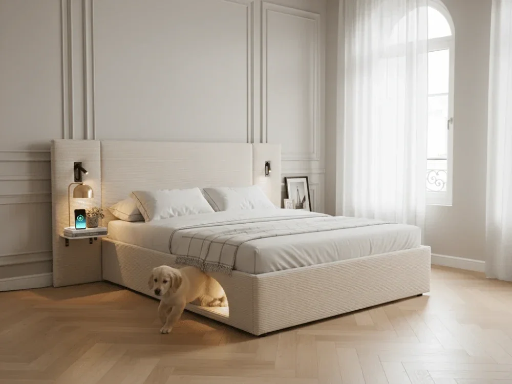 Le lit Élysée – CosyPet Edition est bien plus qu’un simple lit : c’est une pièce centrale de la chambre, pensée pour allier design contemporain, confort haut de gamme et fonctionnalité maximale. Entièrement équipé, il est livré avec toutes ses options incluses, sans compromis.